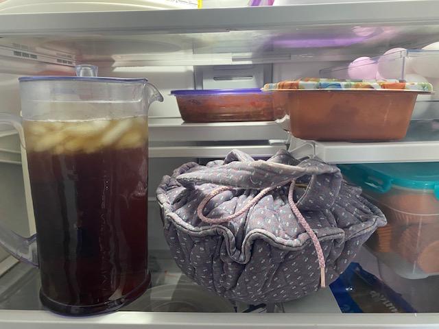 Iced Tea in the pitcher; Tuna-nunna in the cloth carrier, egg salad in the brown bowl above, and my Stuffed Pepper soup in the bowl with the purple lid. All set!