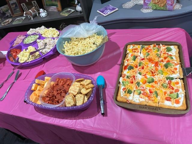 A few minutes later Beth, Holly and Karen O arrived. Everyone always brings the best food! We had egg salad, chicken salad, and chipped ham for sandwiches, with lettuce and tomatoes. Also cheeses, pepperoni, and crackers. Colleen brought macaroni salad, Kathy brought veggie pizza. Beth brought the Hawaiian rolls and the mini rolls.