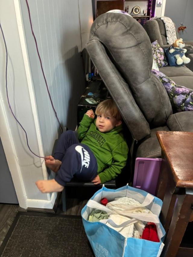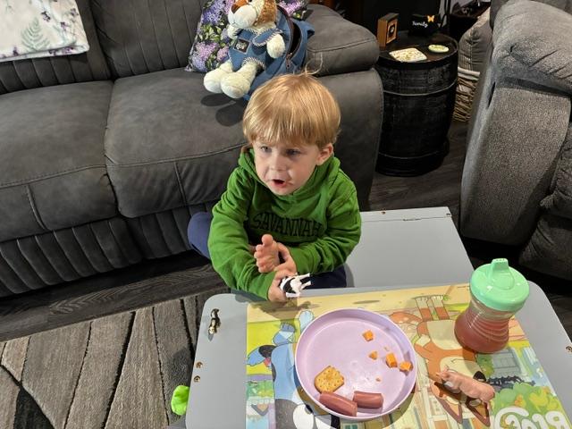 Since I picked him up at noon, we ate right away. He had Vienna sausages, crackers and cheese. His favorite is cheese. I think he’d eat that all day! That, and M&M’s (but we waited for those). He loves to hide, so he sat on the little bench behind the couch for a while.