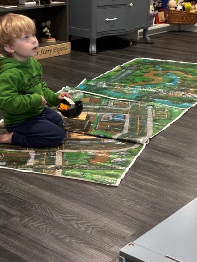 We played some games and read some books, then got out the plastic Match Box mat. The cars kept getting stuck in the creek (yes, he said creek!) and he’d rescue them with the milk can ladle!
