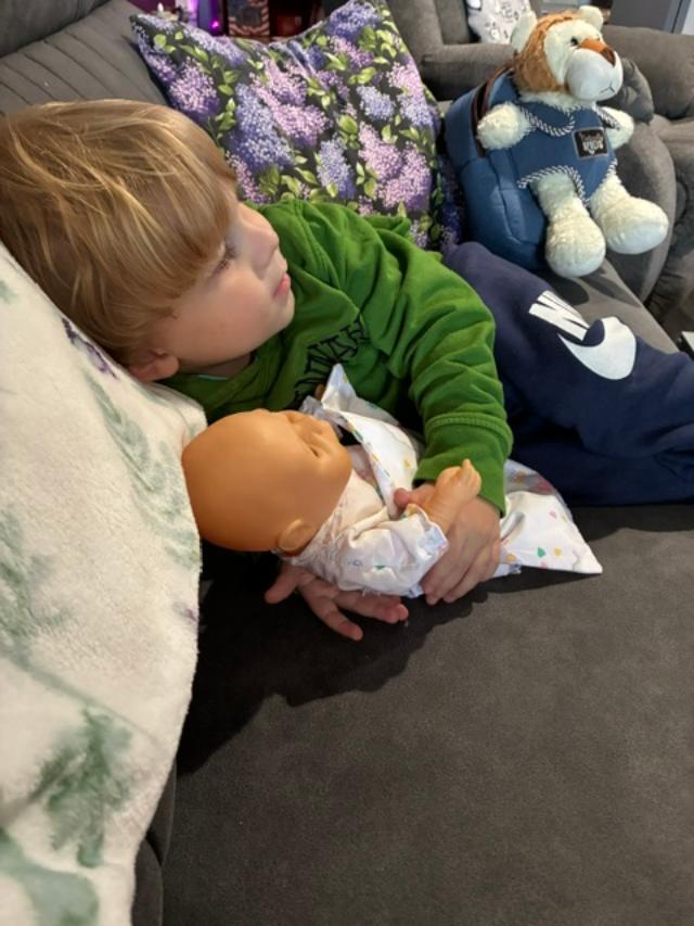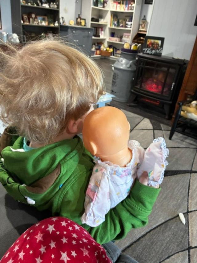 Next he decided to take care of his baby. He loves to feed it and wrap it in a blanket and carry it around. He was being exceptionally tender and I told him he was a very good Dad!
