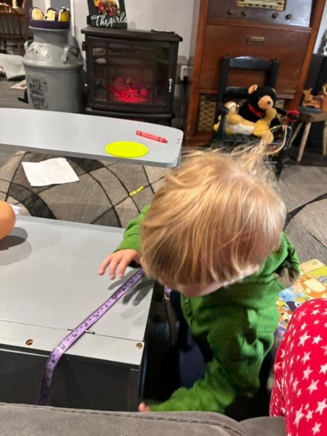 Kelly txt me about making her pillowcases, so Cameron and I went upstairs to measure mine. She needed to know how much material to buy. I measured and wrote it down – but then Cameron needed to measure too! He was measuring everything in the house and writing it down. For ‘Aunt Kelly’! He insisted on putting the note card on her bed in her room! So I guess she’ll need an interpreter!