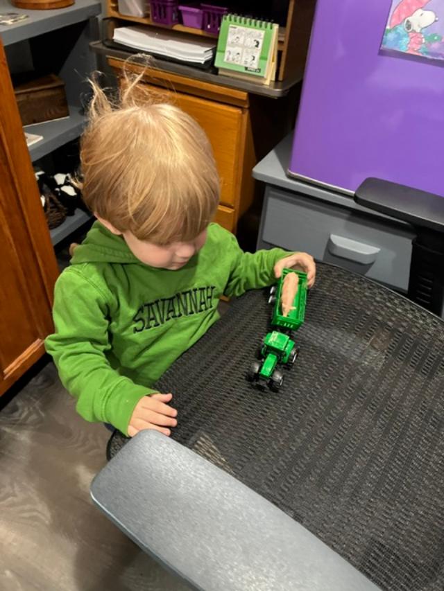 So – now to recap yesterday! Cameron was fun and exceptionally co-operative. He’s moving in the right direction. I’ve seen some changes in him even since his last visit. I think he knows how to push his Dad’s buttons, though. As usual, the first two things he went for were 1) his cows. 2) his farm! He likes giving the pig a ride in the tractor.