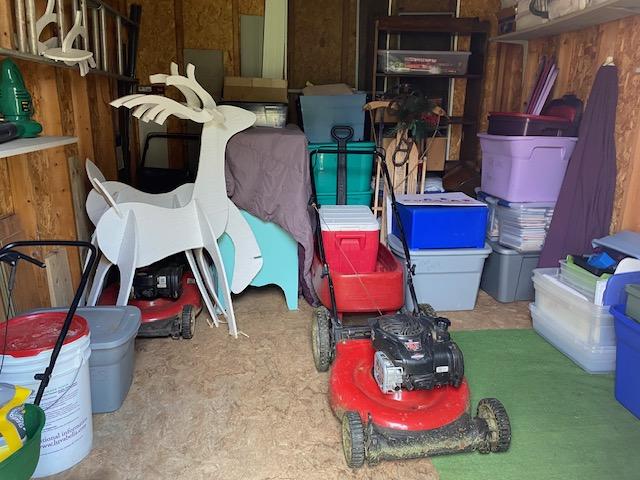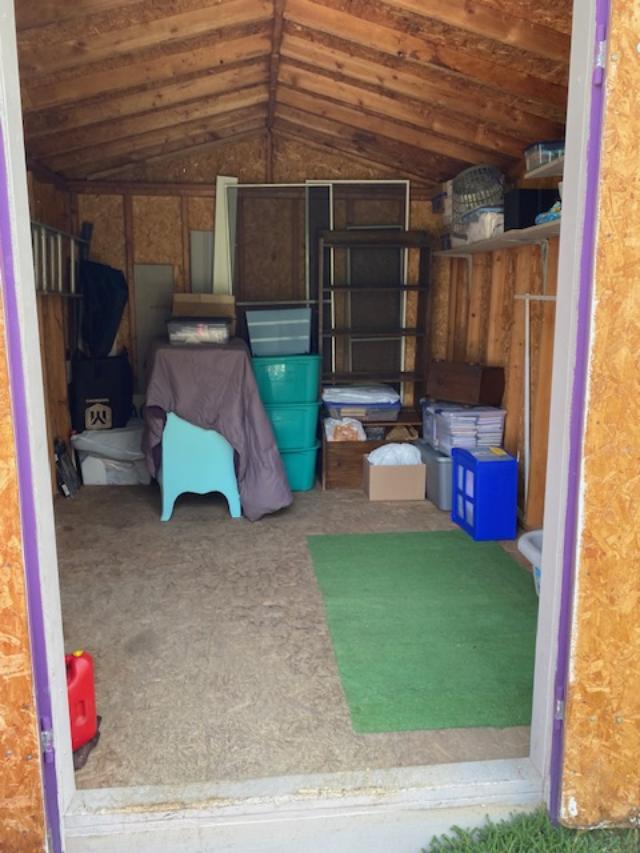 Started the laundry first thing, then had an egg and toast for breakfast. I considered mowing but decided since there was such a nice breeze I would work on the shed. I knew I couldn’t take everything out – there are a few pieces of furniture in there that I can’t move. And a few heavy boxes of books. But I took most of everything else out there. I only had a few boxes put back when I realized I should take an ’empty’ picture.
