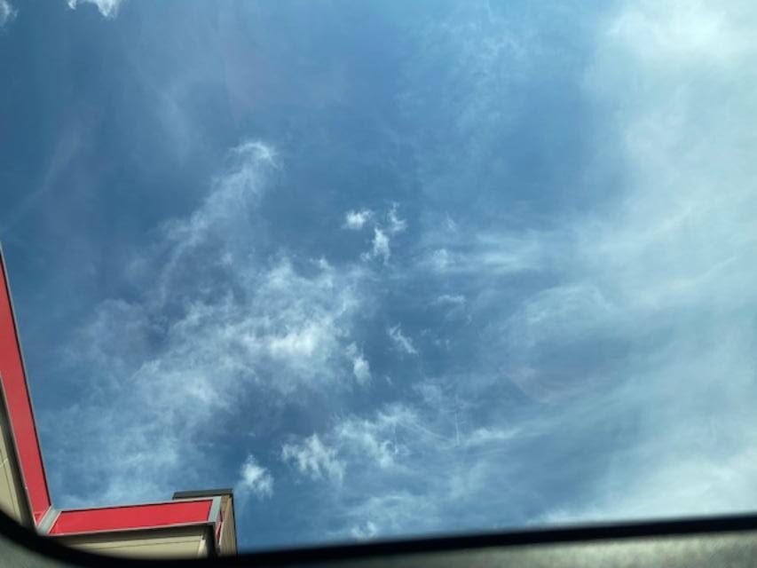 Before I changed my mind, I drove the donation things down to Goodwill. I decided to grab a frozen Coke – but the car ahead of me in the drive-thru must have ordered half the store. I sat for over 10 minutes behind them in line. So I took a picture of the sky through the sunroof!