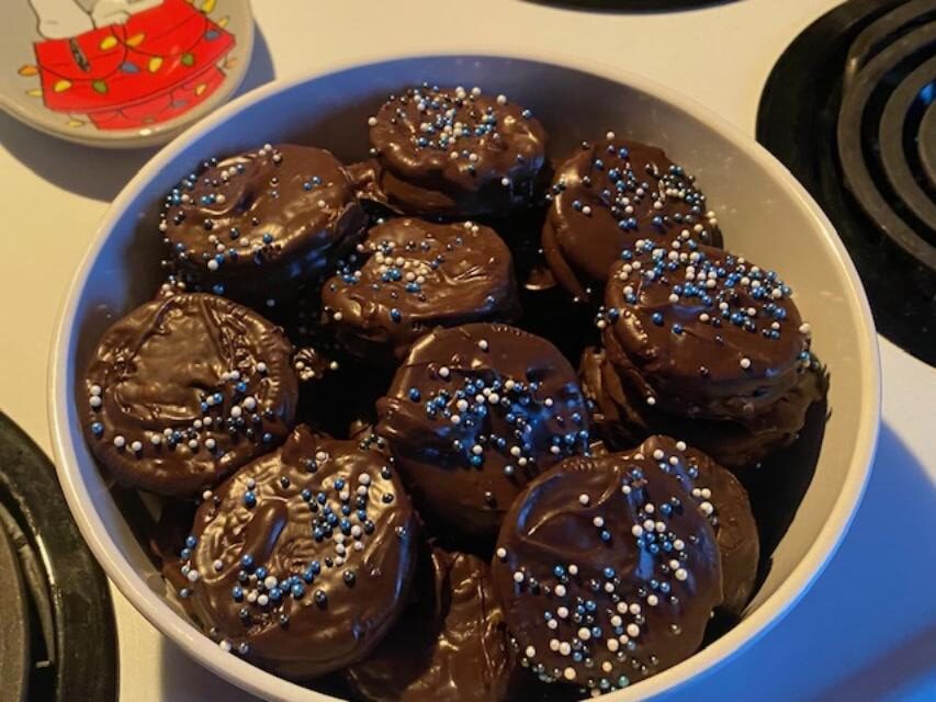I worked a bit this morning but it was a slow day. Stopped at Walmart to get 3 non-grocery items and discovered my sister in the Vitamin aisle! As expected we stopped and chatted for a bit before going our way. I still have food items to get before Sunday’s Christmas with the kids, but not much. I dropped those 3 items at home, then went to my chiropractor appointment in Youngwood (then got a frozen Coke at Burger King!). Two more errands and them home. I made the rest of the soup (about half a cup!) for lunch, then melted down the last of the dark chocolate and covered the rest of the Mint Oreos. By the time I cleaned up and made my list for the next week it was time to answer emails and post this.