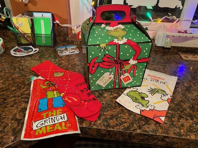 As a ‘reward’ for her, last night for supper we went to McDonald’s. Her one request was that she wanted to get a GRINCH meal. They have dill pickle salt for the fries, and there is a pair of Grinch socks in each meal (They are NOT kids meals!). She said the fries were wonderful! So that was a satisfactory ending to a long 2 1/2 days!