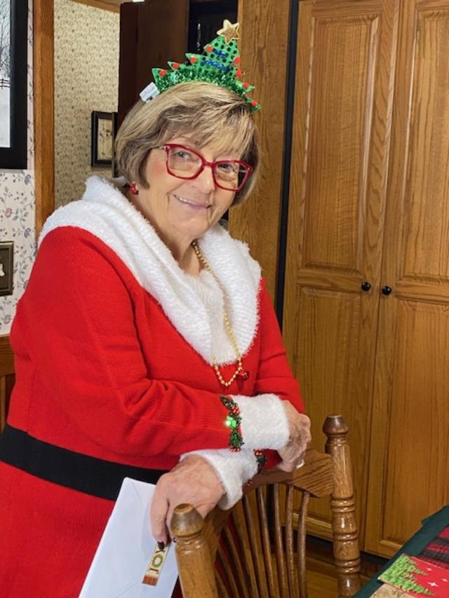 Connie in her Mrs. Santa dress and flashing tree headband.