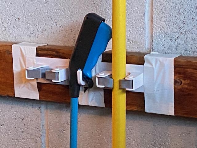 When I went to pull in the garage I noticed that my broom holder had let loose and fell on the floor. I tried to hang a shovel on it – and it’s not made for that. It’s just a Dollar Tree find. So I cleaned off the board and reattached it, and added some duct tape — and removed the shovel!