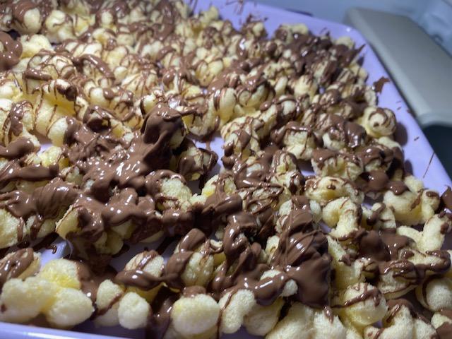 When we stopped at Walmart to stock up on Chase-ables (food), I got a bag of popcorn. Then I came home and melted down some chocolate wafers and drizzled the popcorn. It’s something Chase likes so I don’t think it will last very long!