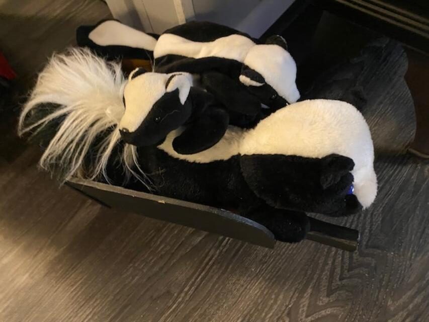 I also found an inexpensive beenie baby skunk – they are normally sort of expensive since they are pretty rare – so I scarfed it up. He rode home on my dash and is now happily cuddled up with his mother and sister!