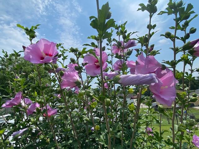 Rose of Sharon flowers looking to the sky.