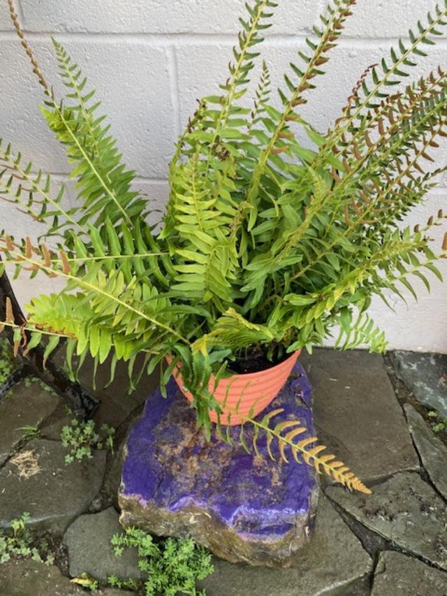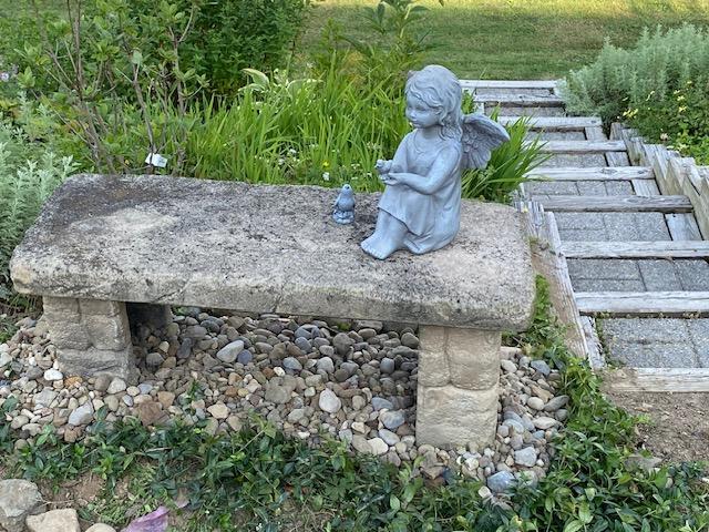 Once I folded the laundry and put things away, I put my yucky clothes back on and went outside again. It was much hotter. I finished weed whacking, talked to my neighbor Karen for a while (she’s still sharing the little Jesus’s that I gave her and having fun with them!), and potted the fern. I moved the cement bench by the fire pit (since I’m dismantling it) and filled in around it with stones. That bench – in three parts – is super heavy! I probably wasn’t smart to move it my myself. I didn’t carry it – I sort of skootched it along! I hope to get help actually moving the blocks and cleaning up the little pebbles. I know – ‘good luck with THAT’!