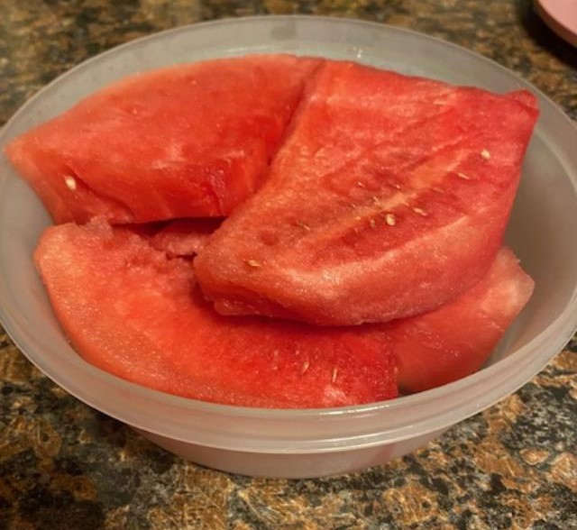 Once I came back in, I took the ripped pocket flaps from a pair of old shorts. Then I cut the watermelon and there was SO MUCH! I took two big bowls over to Kathy’s picnic – and still have plenty at home for me.