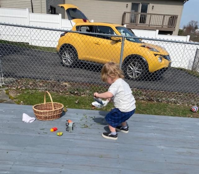 I was just pulling into the garage when Autmn called. She and Cameron were looking for a place to hang out, grab some lunch, and maybe clean out the Juke (their car). So after a Jack’s Pizza and some cheddar rice we grabbed shoes and toys and went outside. Cameron had two of his farm cows and the little dump truck. He ‘dug’ weeds, loaded up the truck bed, then drove it across the deck to feed his cows. I know he played with that for about an hour. I can’t say that he only dug ‘weeds’ – but no harm done! We sent to the bottom yard, and he discovered a worm half buried in the dirt. No problem – he just cleared away the dirt (with his hands) and picked up the worm, which he carried up to show his mom. We spent the next half hour looking for more worms!
