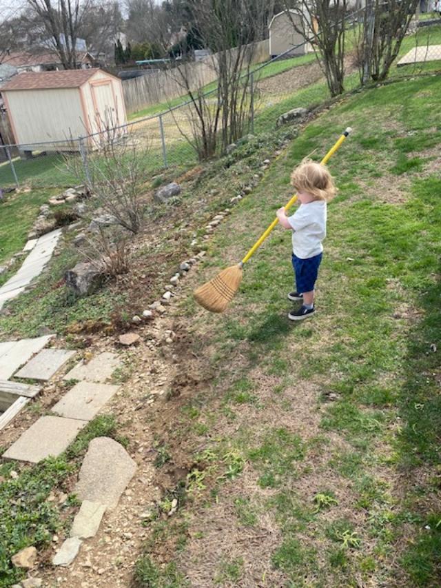 Autmn took everything out of the car, wiped it down, swept it out, then washed and rinsed it. Cameron and I cleaned off the car seat. Then while I helped put everything away, Cameron did an excellent job of sweeping the grass. ???