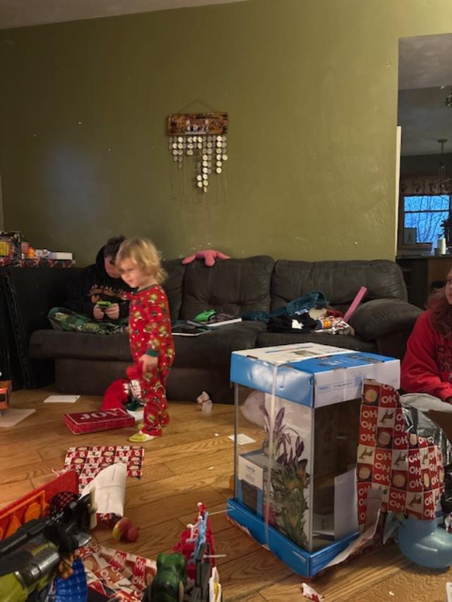 Last night Autmn’s family stopped here to get Cameron a bath. They were staying at her mom’s overnight and all they have are showers. All he wanted to do was play with his barn and the mailbox with the snowball in it. This morning Autmn sent me a picture of Cameron opening his gifts – she said it was chaos there for sure. But they all had fun.
