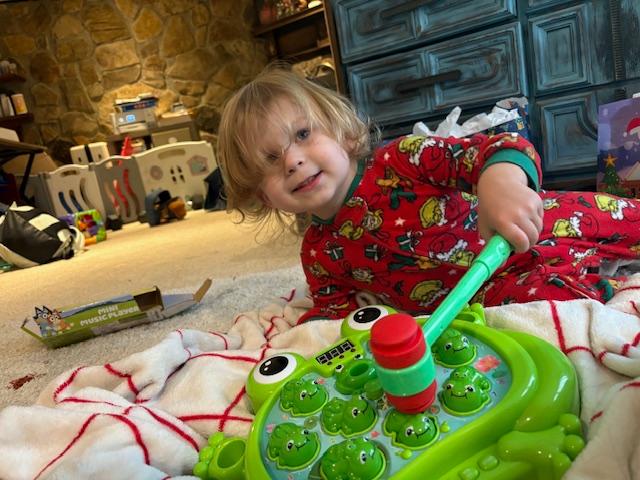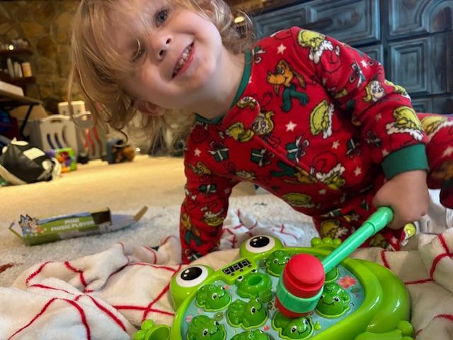 After I picked up the pack n play, Noah, Autmn and Cameron went to his mom and step-dad’s for lunch and part of the afternoon. Again, more gifts, and it looks like he was enjoying the frog! I could use a turn at whacking something….