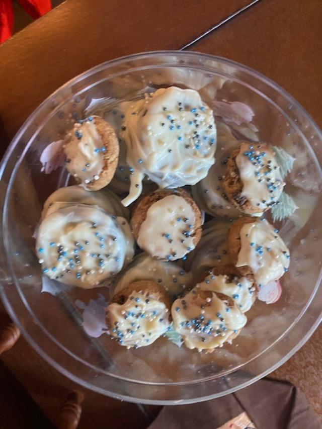 Once the brownies were done and put in travel containers, I melted down some white chocolate and covered the rest of the holiday Oreos (not mint). Melted enough to cover a few mini-chocolate chip cookies, too.