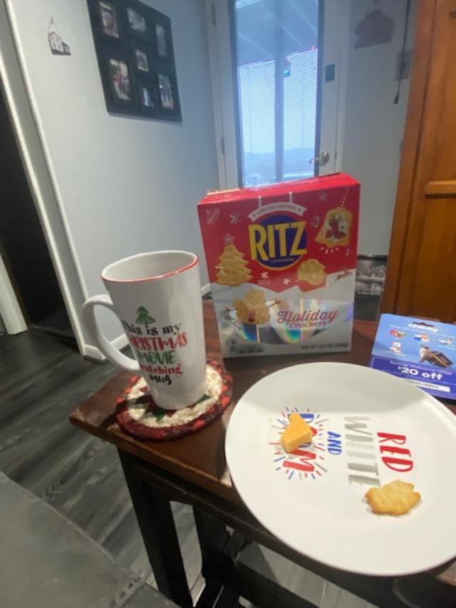I came in and threw all my snow clothes in the dryer, then made a cup of tea. I had my Holiday Ritz crackers and a few bites of cheese. I put the Christmas blankets away and got the winter ones out, and changed the coasters (I won’t tell you how many I have…).
