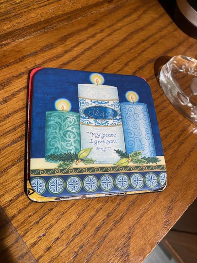 Kathy knows I love coasters so she bought me one for encouragement. The middle candle says PEACE – “My peace I give you.” John 14:27 One of my favorites.