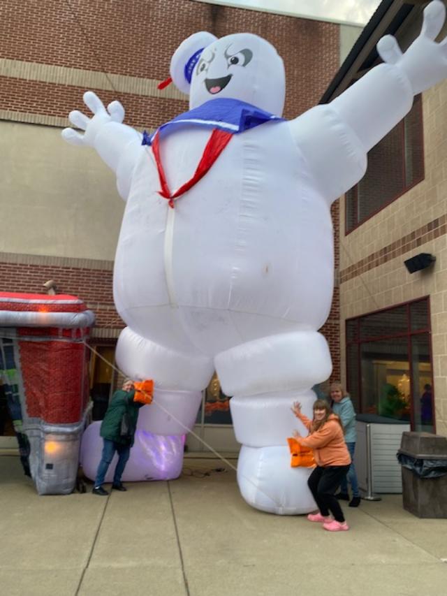 Kathy, Mae, and Kelly holding up the ghostbuster.