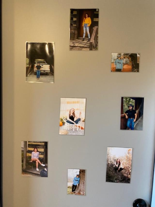So Kelly took a few minutes and laminated the senior pictures for Autmn, Peyton, Christina and Logan. I had them in soft plastic magnetic frames, and the frames were falling apart and shredding and falling off the door. So I put magnets on the back of the laminated photos and the door looks fresh! Thanks Kelly!