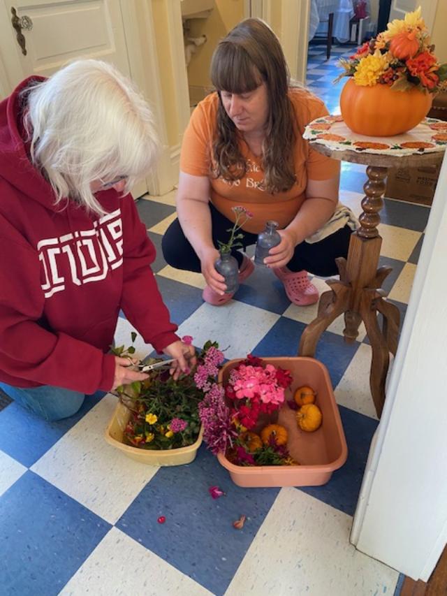 Becky and Kelly filling vases with fresh flowers.